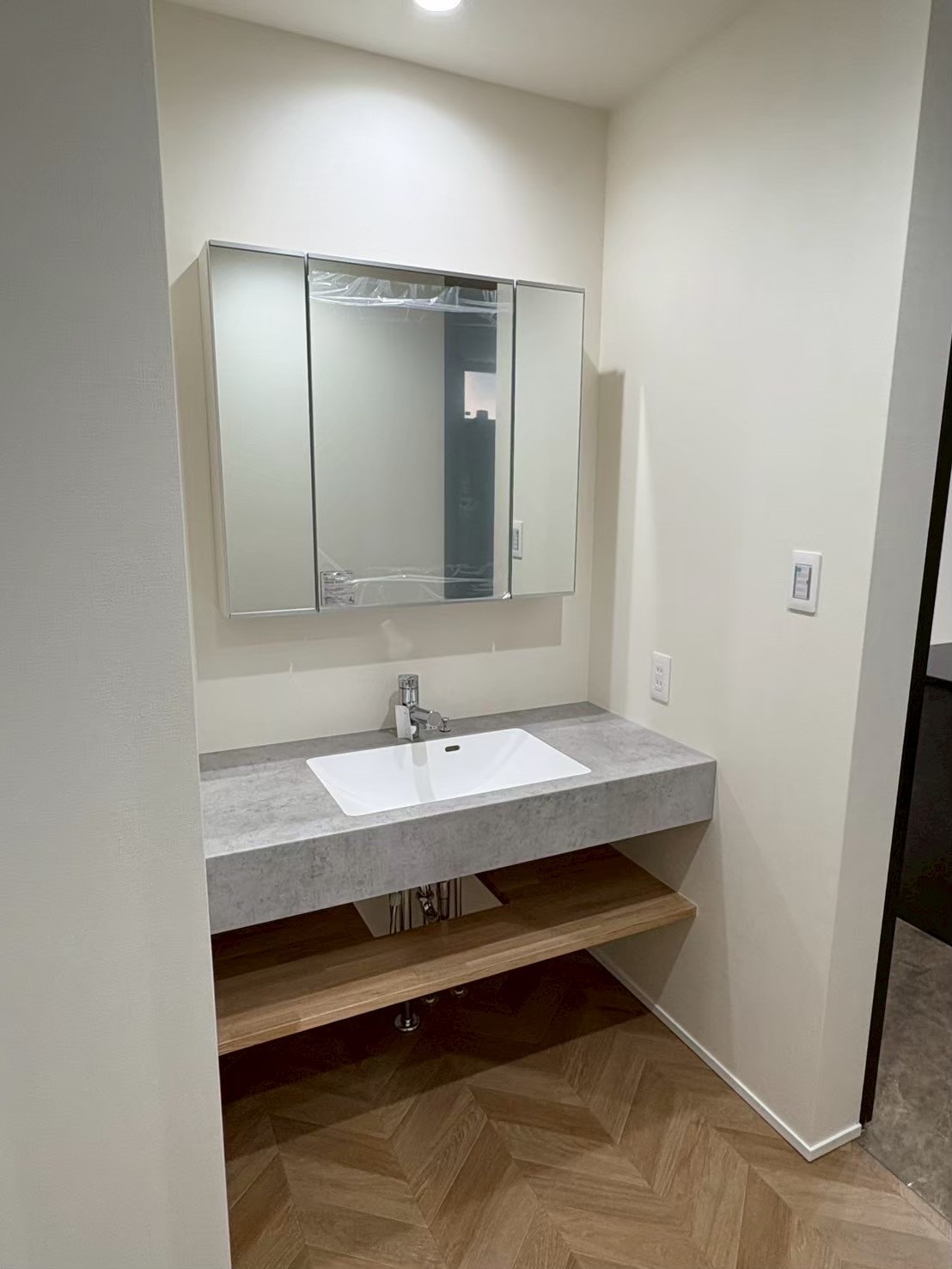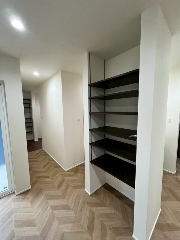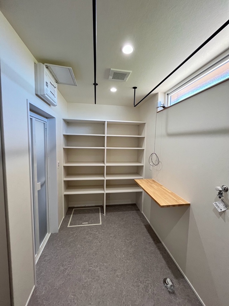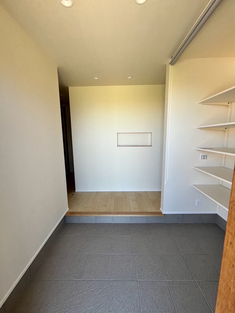 玄関横に外靴のまま入れる土間収納を設けました。趣味の道具を飾れる「手作り木棚」(作る様子はYouTubeにて配信中)を設置。木工作業を得意とする弊社の職人らしさを出せました。